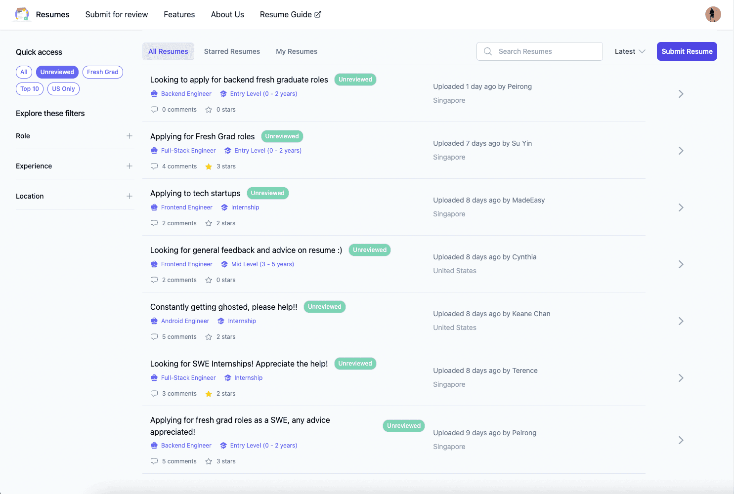 Get valuable feedback from the public or checkout reviewed resumes from your fellow engineers
